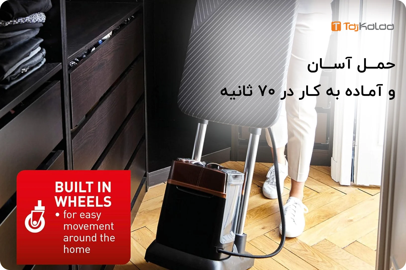 این محصول با طراحی ایستاده و مدرن، مناسب خانهها و حتی محیطهای کاری (بوتیکها و مزونها) است. پایهی ایستاده محکم، میلهی تلسکوپی قابل تنظیم و صفحهی پرس با سایز مناسب، استفاده از آن را راحت و کاربردی کرده است. علاوه بر این، چرخهای روان زیر بدنه، جابهجایی دستگاه را آسان میکند.