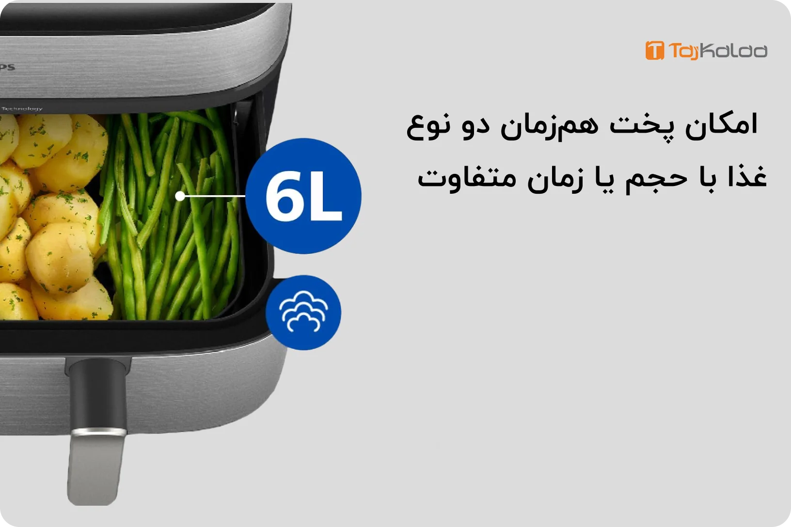وجود دو سبد مجزا بهکاربر اجازه میدهد همزمان دو نوع غذای متفاوت را بپزد، بدون اینکه طعمها ترکیب شوند. این ویژگی برای خانوادههای پرجمعیت یا زمانی که مهمان داری، یک مزیت بزرگ محسوب میشود.
