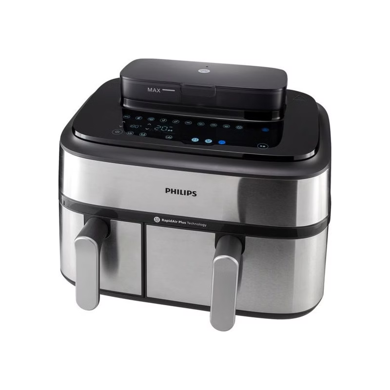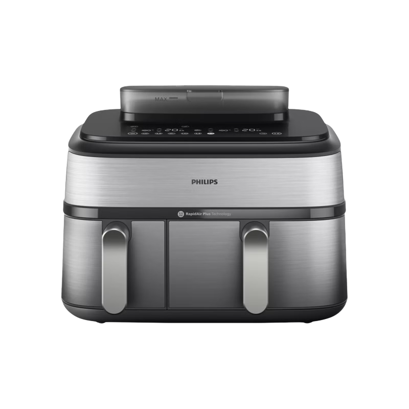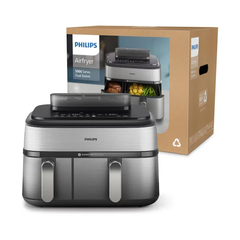 اینجاست که سرخکن دوقلو فیلیپس مدل NA555 وارد میدان میشود؛ دستگاهی با دو محفظهی مجزا و توان فوقالعاده ۲۷۵۰ وات که بهصورت همزمان دو نوع غذا را با دمای یکنواخت و بدون روغن زیاد آماده میکند. ظرفیت ۹ لیتری آن برای خانوادههای بزرگ یا مهمانیهای چندنفره عالی است و فناوری گردش هوای داغ Rapid Air تضمین میکند هر لقمه ترد، آبدار و سالم باشد.