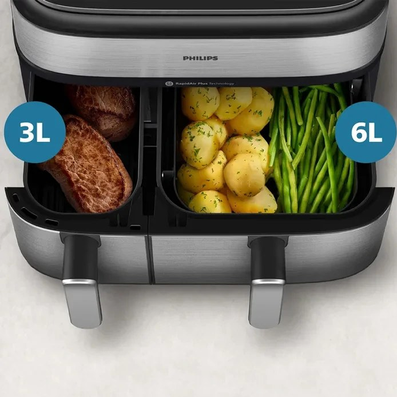 وجود دو سبد مجزا بهکاربر اجازه میدهد همزمان دو نوع غذای متفاوت را بپزد، بدون اینکه طعمها ترکیب شوند. این ویژگی برای خانوادههای پرجمعیت یا زمانی که مهمان داری، یک مزیت بزرگ محسوب میشود.
