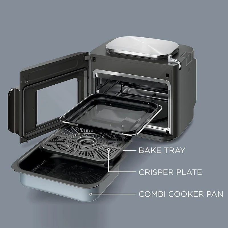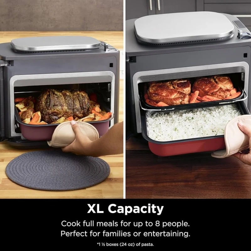 این مولتی کوکر و فر دارای ظرفیت مناسبی است که به شما اجازه میدهد حتی وعدههای بزرگ خانوادگی را نیز آماده کنید. سینیهای داخلی با طراحی انعطافپذیر، امکان پخت همزمان چندین غذای مختلف را فراهم میکنند. در نتیجه میتوانید بهراحتی یک غذای کامل شامل پیشغذا، غذای اصلی و دسر را همزمان بپزید.