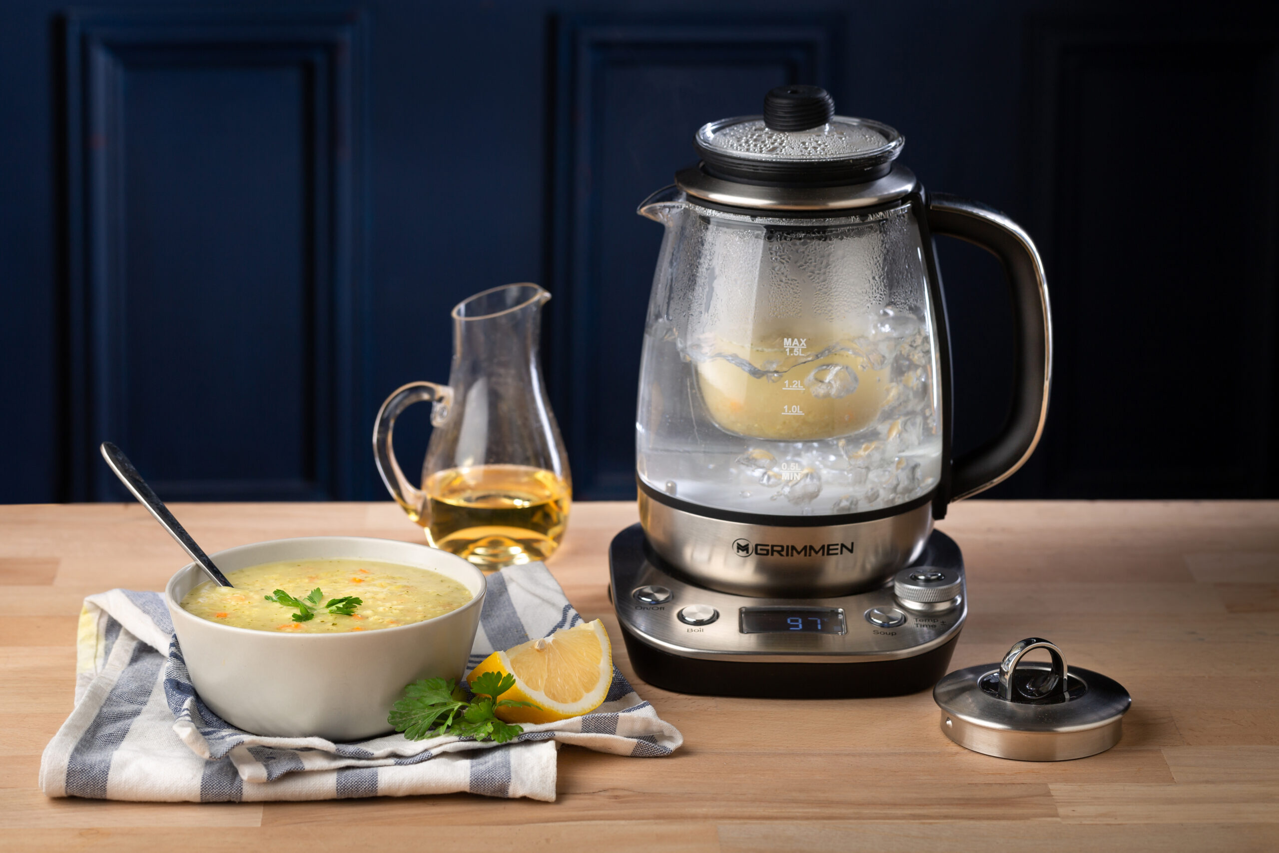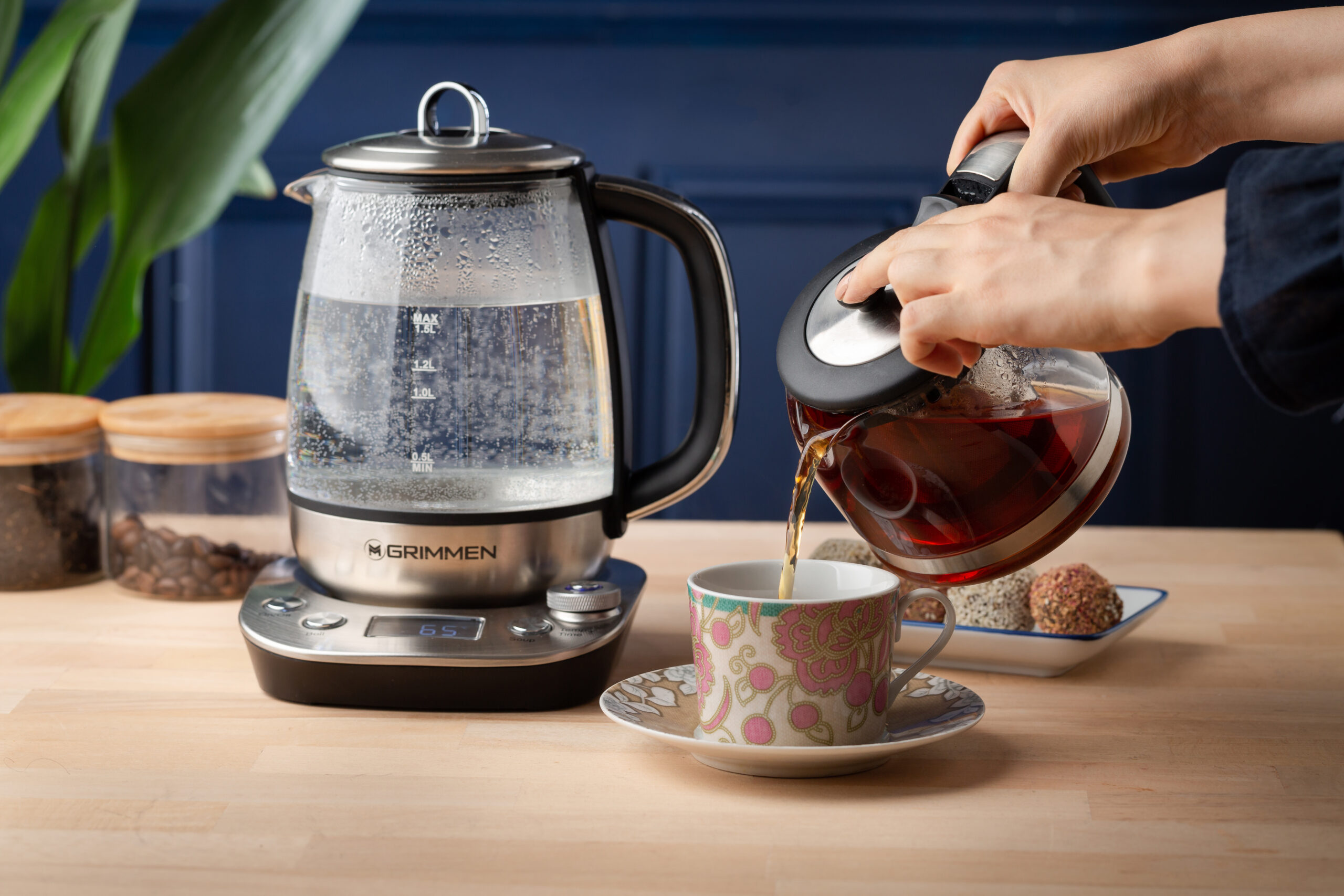 برای دمکردن چای با نحوه استفاده صحیح از چای ساز گریمن، اول آب رو در کتری بریزید، صافی رو درون قوری قرار بدید و دمای مناسب (مثلاً ۸۰ درجه برای چای سبز) رو تنظیم کنید. پس از جوش آمدن، قوری بهصورت خودکار بالامیاد و تایمر دمکردن فعال میشه.