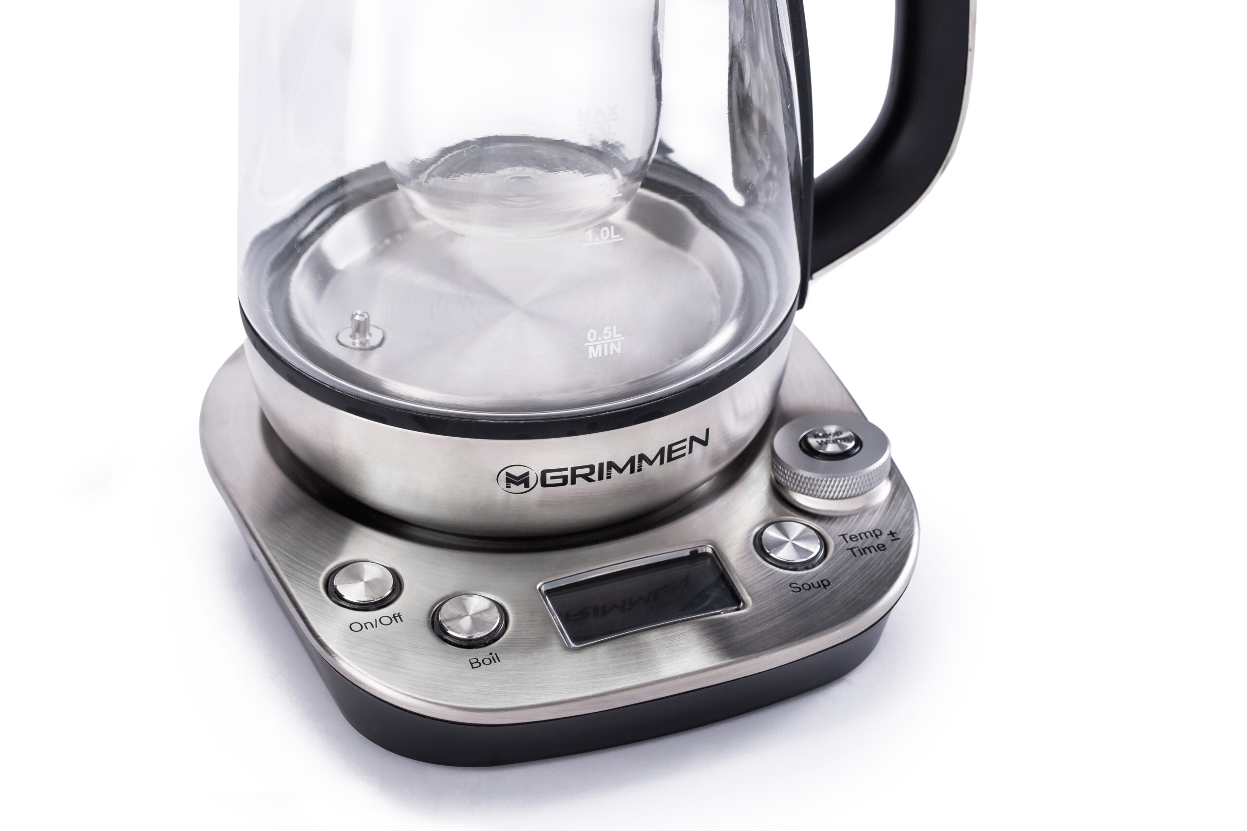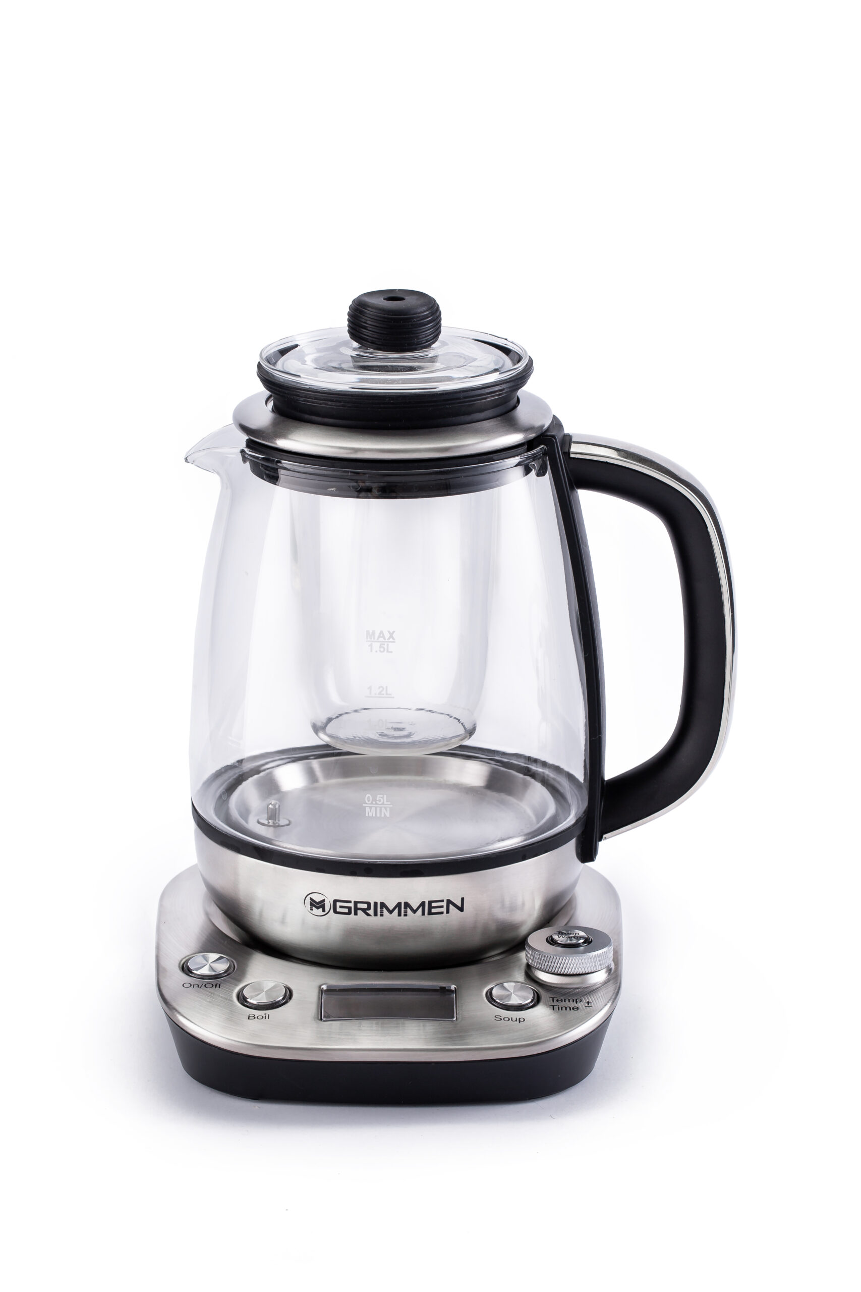 در مشخصات چای ساز گریمن GR-SKC325 علاوه بر قوری و کتری، صافی فلزی ریزبافت داریم که ذرات چای رو نگه میداره و چایت کاملاً شفاف درمیاد. صفحهنمایش LED روی پایه، دمای فعلی و تایمر دمکردن رو نشون میده.