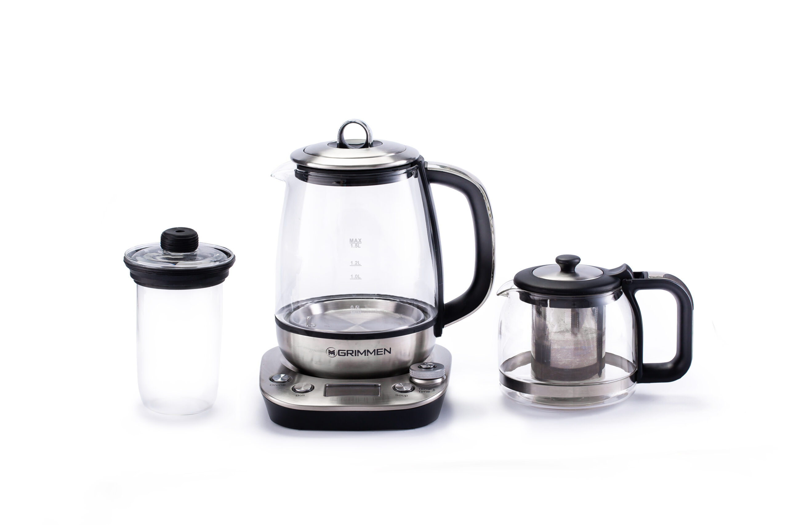 چای ساز گریمن مدل GR-SKC325 ترکیبیه از یک قوری برقی و کتری هوشمند که کار دمکردن و جوشآوردن آب رو با هم انجام میده. طراحی شیشهای قوری اجازه میده رنگ چای رو ببینی و مطمئن بشی دمش به حد دلخواهت رسیده. بدنهی کتری از جنس استیل ضدزنگه و مقاومت خوبی داره، ضمن اینکه پایهی چرخان ۳۶۰ درجه آزادی عمل شما رو بالا میبره.
